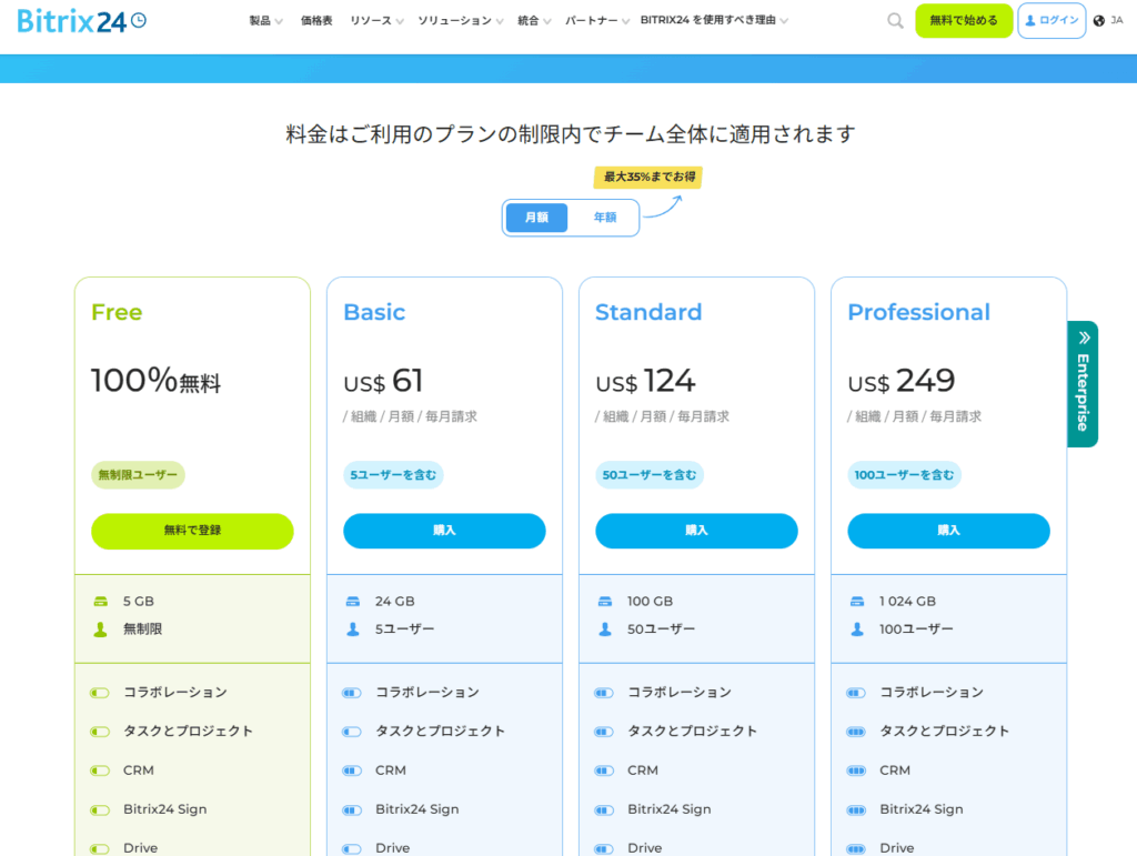 Bitrix24には無料プランと有料プランがあります。無料プランはユーザー数無制限で、基本的なCRMやタスク管理機能が利用できます。有料プランには、Standard、Professional、Enterpriseがあり、ユーザー数やストレージ容量、利用できる機能が異なります。10名程度のチームであれば、月額124ドルのプランが利用可能です。