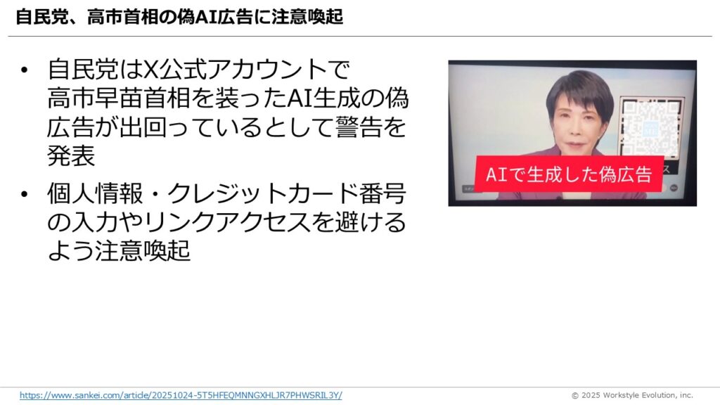 ・自民党はX公式アカウントで高市早苗首相を装ったAI生成の偽広告が出回っているとして警告を発表