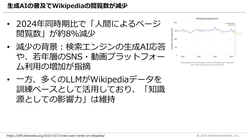 ・一方で、多くのLLMがWikipediaデータを訓練ベースとして活用しており、「知識源としての影響力」は維持