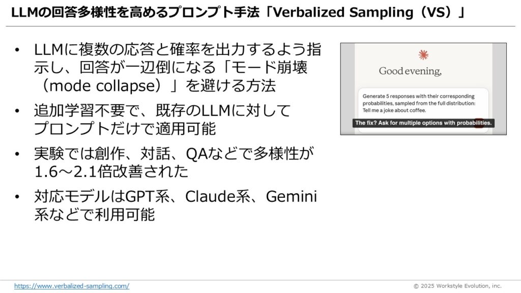 ・LLMに複数の応答と確率を出力させることで回答が画一的になる「モード崩壊」を避けるプロンプト手法