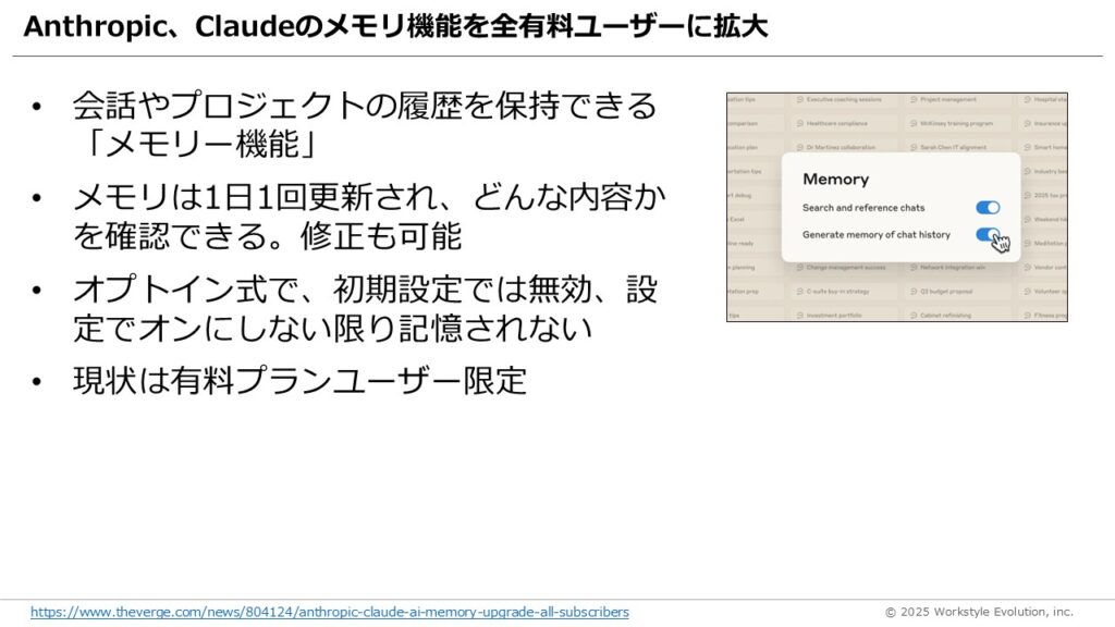 ・Anthropic Claudeの「メモリー機能」を全有料ユーザーに拡大