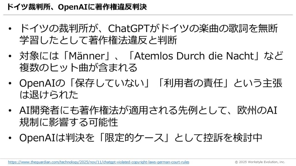 ・ChatGPTがドイツ楽曲の歌詞を無断学習し著作権法違反と判断