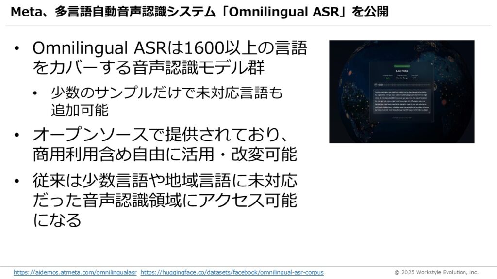 ・「Omnilingual ASR」は1600以上の言語をカバー