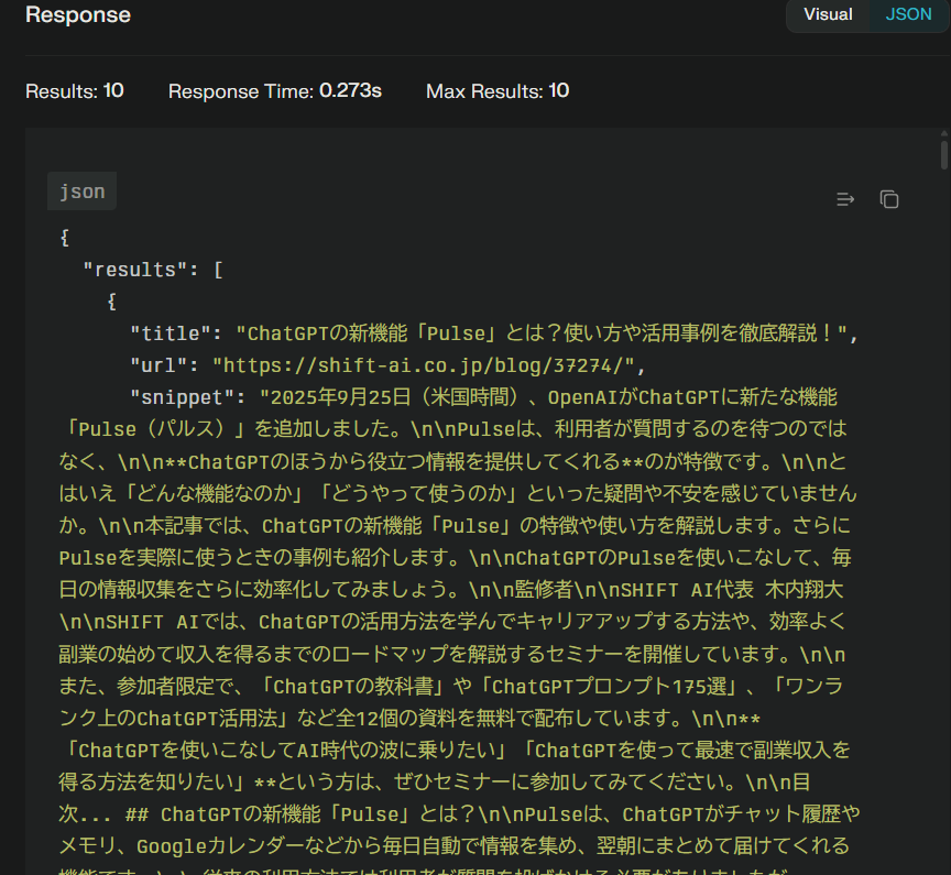 Perplexity Search APIの真価は、実際に使用してみることで実感できます。APIプレイグラウンドでの検索体験は、従来の検索サービスとは明らかに異なる印象を与えます。