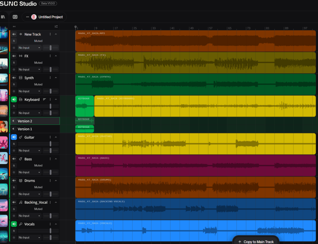 Suno Studioは、最大12トラックのオーディオステム分離機能を備えています。これは業界でも非常に高いレベルの分離精度であり、ボーカル、ドラム、ベース、ピアノ、ギター、シンセサイザーなどを個別のトラックとして扱うことができます。