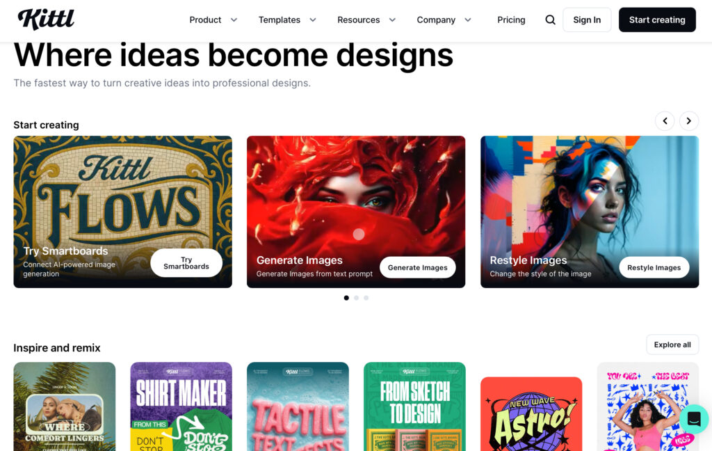 Kittlは、すべての主要編集機能とテンプレートへのアクセスに加え、SNSグラフィック作成に最適なAIアート生成ツールを備えた充実の無料プランを提供しています。デザイン経験がなくても、Instagramストーリーテンプレート、Facebookカバー画像、Pinterestピンを簡単に作成でき、AIを使ってブランド美学に合わせたカスタムイラストや背景を生成できます。