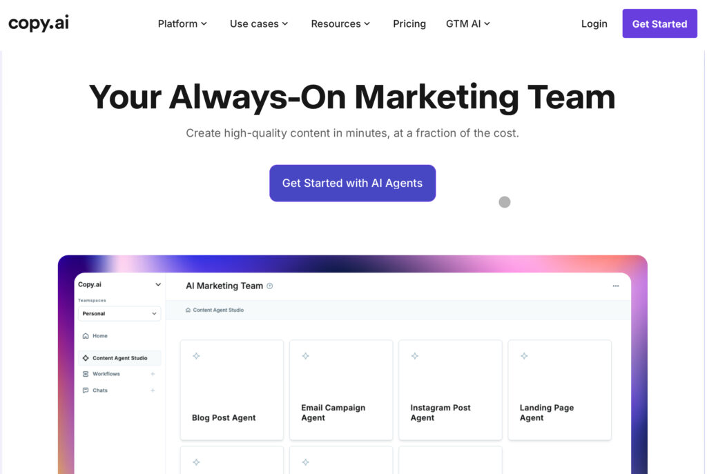 Copy.ai | キャプション・コピーライティング | SNSコピー用のテンプレート、コンテンツ作成ワークフローの自動化、チーム共同作業とブランドボイス学習 | 無料プラン、Chat: $29/月、Agents: $249/月 |