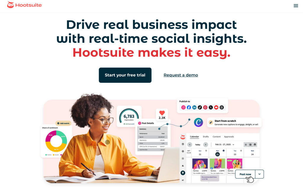 Hootsuiteは30日間の無料トライアルを提供しており、プラットフォームのコンテンツ管理インターフェースへのアクセスを提供します。エンタープライズレベルのSNS管理ソリューションを評価しているユーザーに最適です。