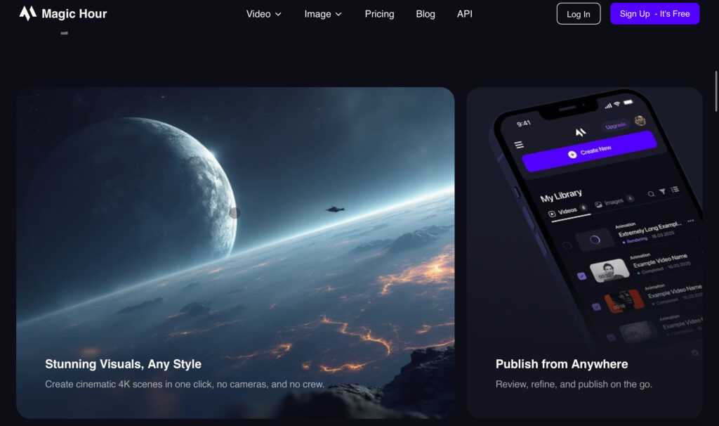 Magic Hourは、大量コンテンツ制作に特化したAIコンテンツ生成プラットフォームです。既存の動画や画像を新しいフォーマットやスタイルに変換することに長けており、複数プラットフォームやオーディエンス向けにコンテンツを再利用する必要があるSNSチームに最適です。