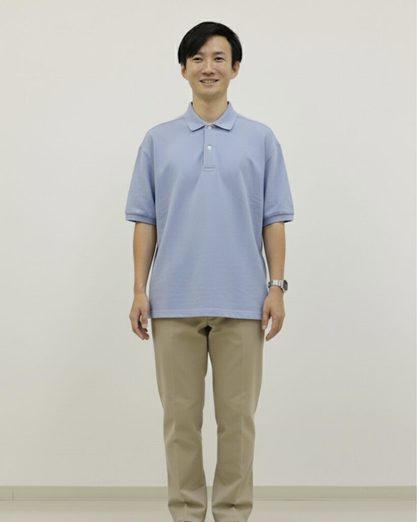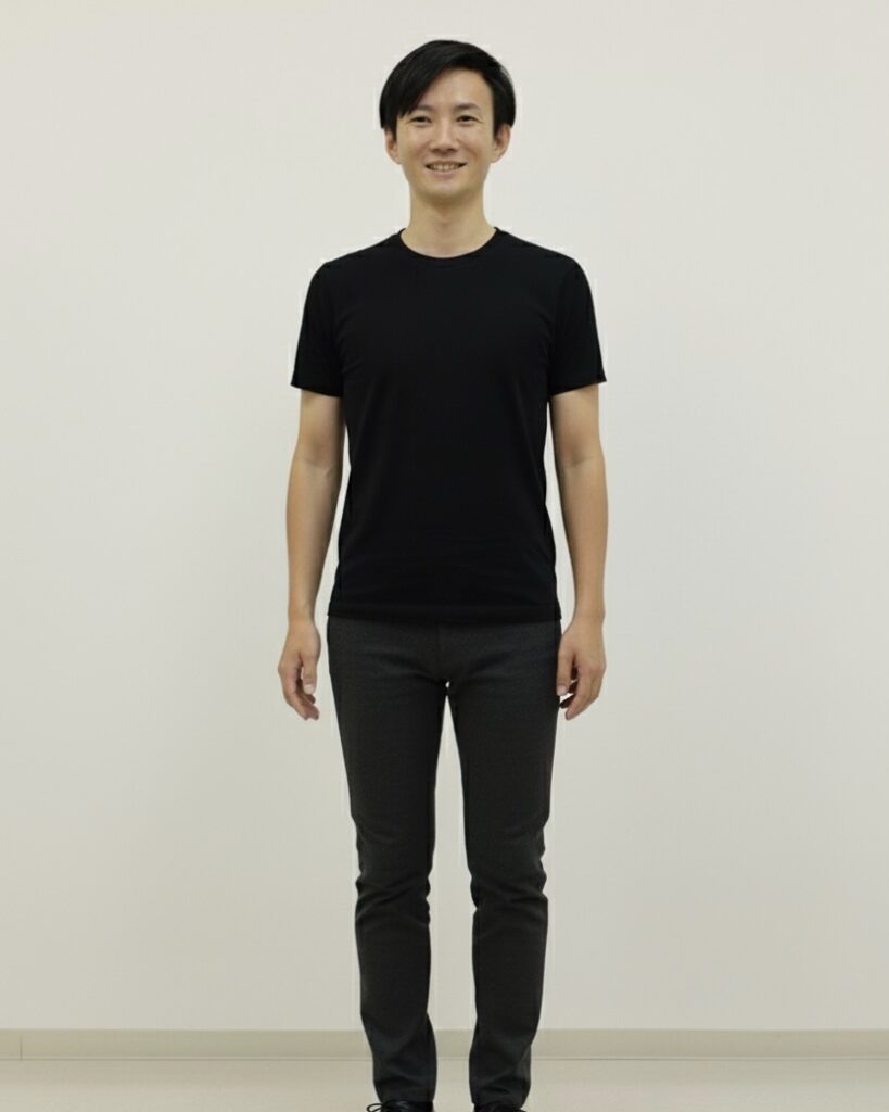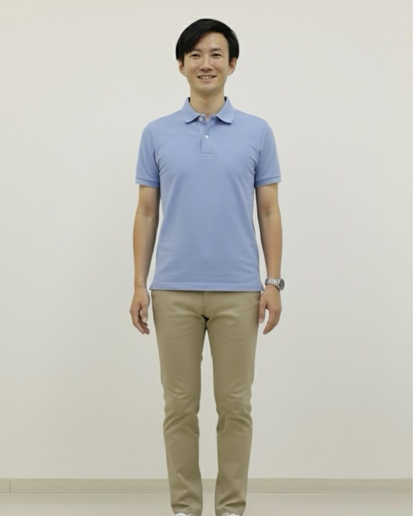 最初に生成した画像では、ポロシャツとパンツが全体的に大きめで、ややだらしない印象が残っていました。そこで「フィット感を高める」に切り替えると、シャツは身幅が調整されて体に沿うラインとなり、肩からウエストまで自然なシルエットに修正されました。パンツも同様に補正され、脚のラインが強調されることで全体がすっきりと整いました。結果として、スマートで引き締まった印象が得られ、より現実的でバランスの取れた仕上がりとなりました。