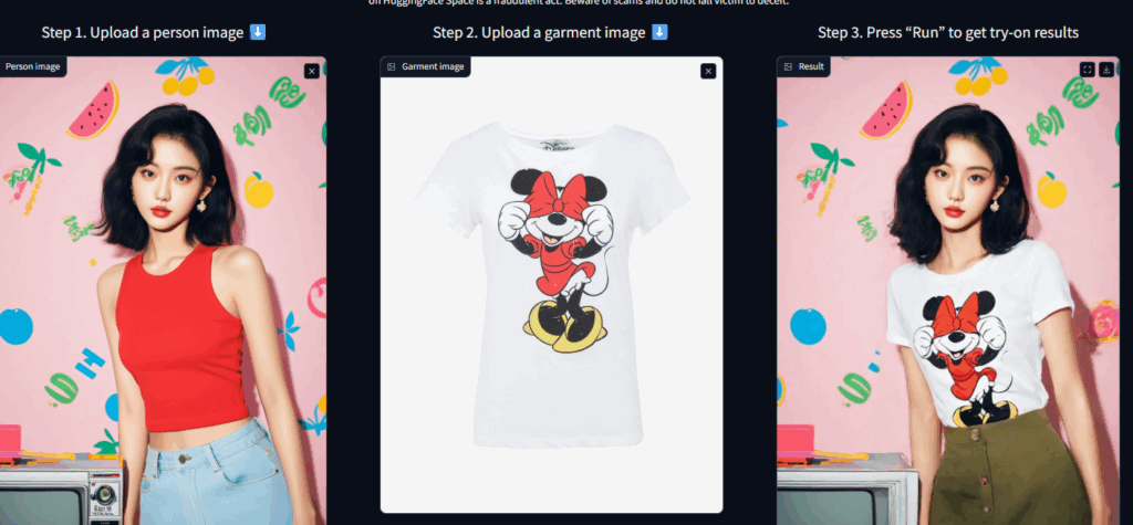 操作は表面的にはシンプルです。ベースとなる人物写真をアップロードし、衣服を選択またはアップロードして、結果をプレビューする、という流れです。しかし、その裏で動いている技術こそが、このツールを際立たせています。