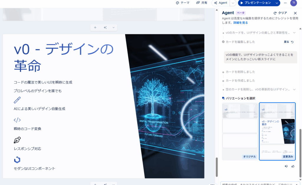 エージェント機能では、コンテンツを保持しながらデザインパターンを自由に変更できます。この機能により、同じ内容でも用途や対象者に応じて最適な見せ方を選択できます。