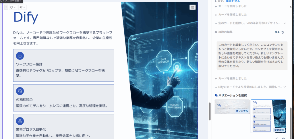 実際に使用してみると、「もっと視覚的にしてね」とお願いするだけで、従来は画像を単純に追加するだけだった機能が、完全に新しいデザインパターンを生成するように進化していることが分かります。カードのコンテンツが自動で設定され、様々なレイアウトパターンが提案される様子は、まさにAIデザインパートナーとしての実力を感じさせます。