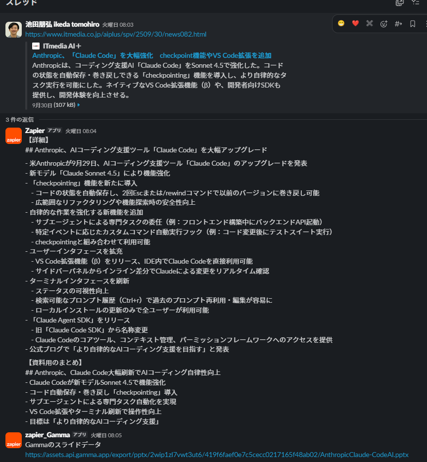 このワークフローにより、ニュース記事が投稿されてから約1分後には、完成されたプレゼンテーション資料がチーム全体で共有される仕組みを実現できました。