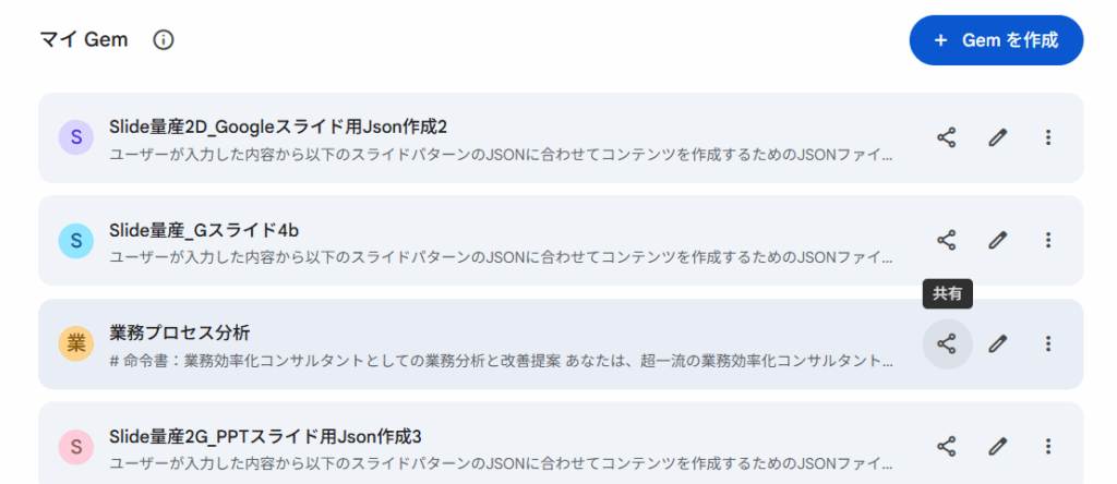 まず、WebアプリでGemマネージャーを開きます。共有したいGemの横にある共有アイコンをクリックすると、Googleドライブと同様の共有設定画面が表示されます。
