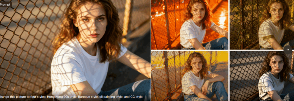 指示例: 「画像Bのカラー・テクスチャスタイルを画像Aの被写体に適用。ポーズと顔のアイデンティティ保持」