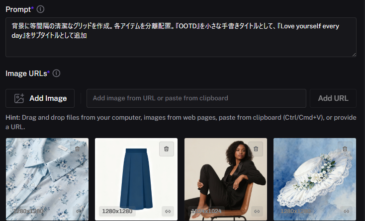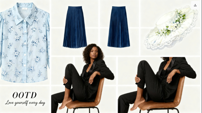 指示例: 「白背景に等間隔の清潔なグリッドを作成。各アイテムを分離配置。『OOTD』を小さな手書きタイトルとして、『Love yourself every day』をサブタイトルとして追加」