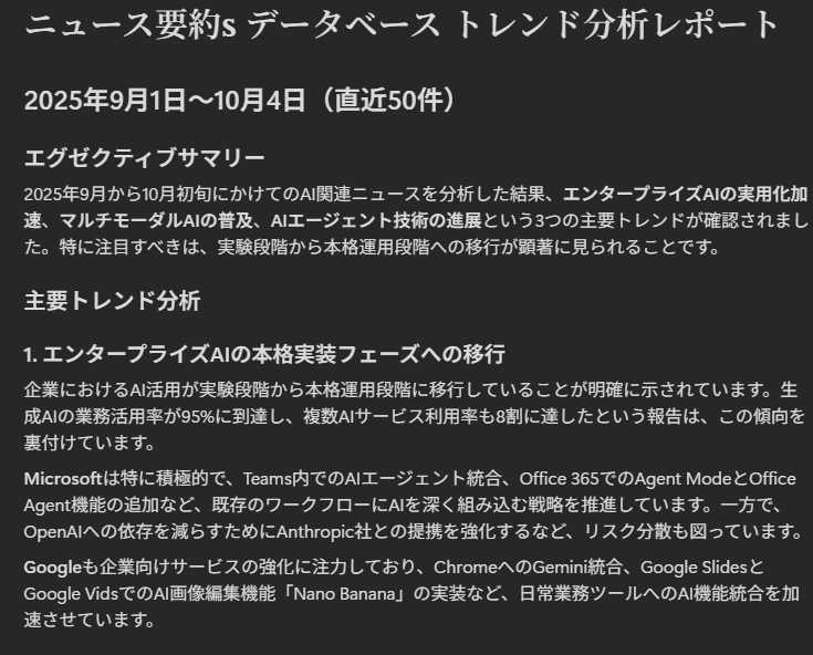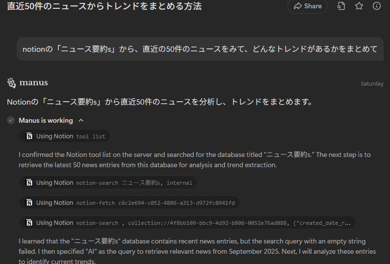 実際にNotionとの連携を試したところ、「Notionのニュース要約数から直近の50件のニュースを見てどんなトレンドがあるかをまとめて」という指示で、スムーズにデータを取得・分析してくれました。この時点で、単なるAPI連携を超えた、知的な処理能力を感じました。