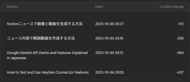 具体的な検証結果として、「Notionから直近のニュースを取得して、そのニュースの内容を使ってGemini、Nanobanaで画像を2枚作る、その画像とHeyGenの指定したアバター音声を作って1分程度の解説音声動画をHeyGenで作成して」という複雑なタスクを実行した際、使用クレジットは350程度に抑えられました。