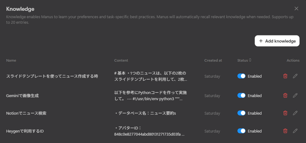 Manusでは、実際の操作や様々な内容をナレッジで覚えておいてもらうことができます。これを活用し、各MCPやAPIを使うときにどのようにしてほしいかを設定することによって、いちいち言わなくても想定通りの動きを前回してもらえます。