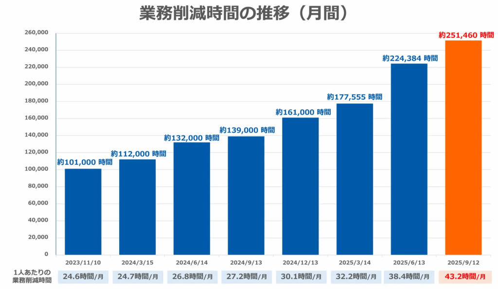 最も注目すべき成果は、月間業務削減時間25万時間という規模です。これを従業員1人あたりに換算すると月間43時間の削減となり、週に約10時間以上の業務効率化を実現していることになります。この数字は、AIが単なる補助ツールではなく、業務プロセスそのものを根本的に変革していることを物語っています。
