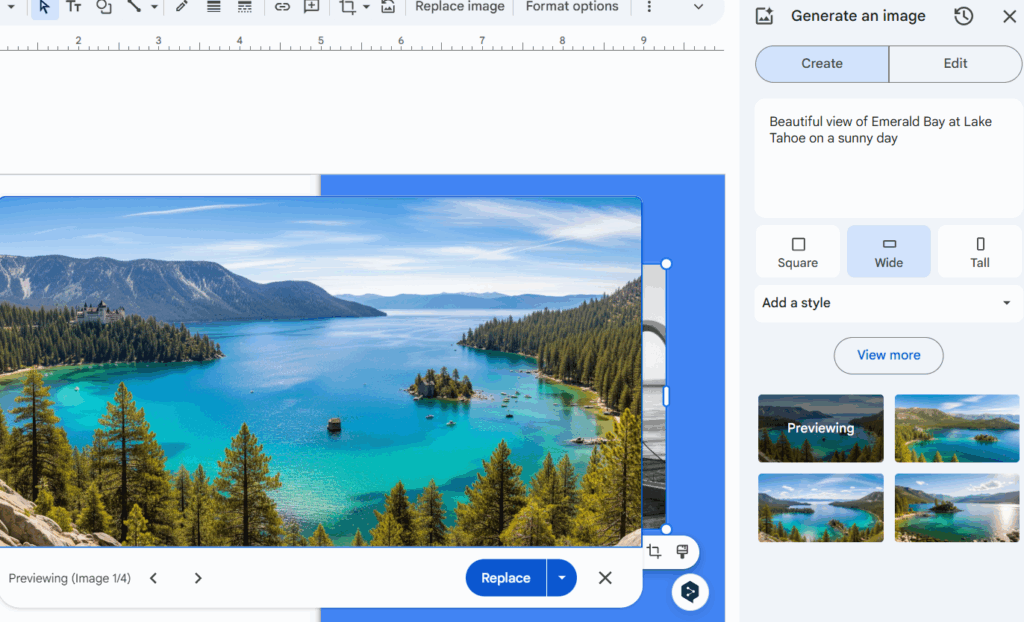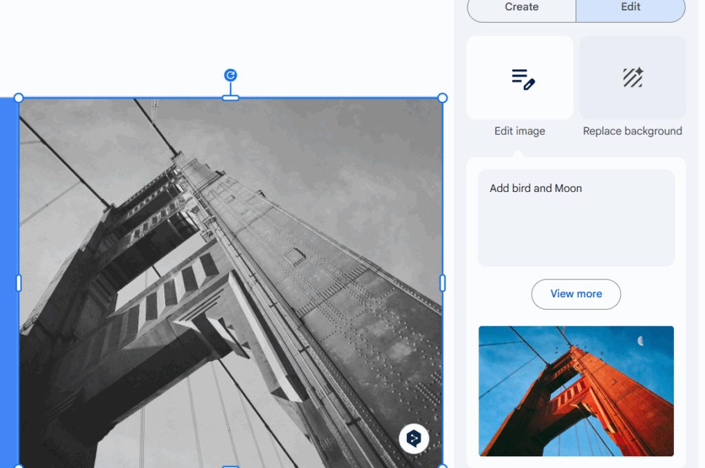 Googleスライドで画像を選択し、「Edit Image」オプションを選びます。すると、編集内容を自然言語で入力できるプロンプトが表示されるので、編集したい内容を入力します。例えば、「Add birds in the sky」と入力すると、AIが画像を解析し、自然な形で鳥を空に追加してくれます。現在は英語版のGoogleスライドでのみ利用可能です。