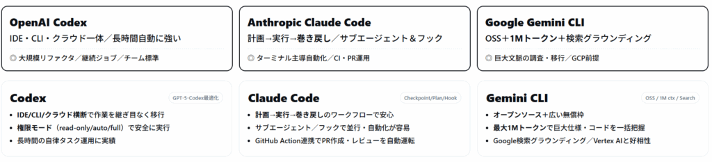 AIコーディング支援ツールが急速に普及する中、Claude Code、OpenAI Codex、Gemini CLIという3つの主要ツールが開発現場で注目を集めています。しかし、それぞれに異なる特徴があり、どのツールをどの場面で使うべきか迷っている開発者も多いのではないでしょうか。