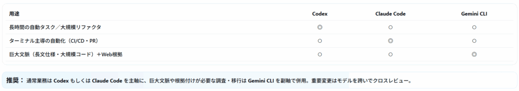 「無償枠の広さと1メガトークンの巨大コンテクスト、Google検索グラウンディングやVertex AI連携重視ならGemini CLI」というのがGPT-5 Proの推奨です。