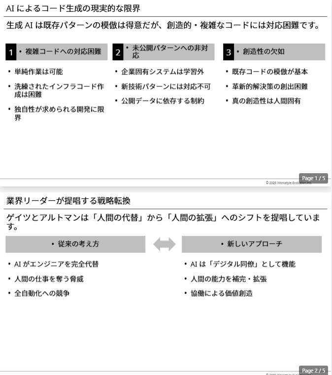 完璧ではないものの、スライドテンプレートをちゃんと作り込めば、それをベースに非常に高品質な資料を作成してくれる可能性が高いと感じました。特に、企業のブランドガイドラインを遵守した資料作成において、大きな効果が期待できます。