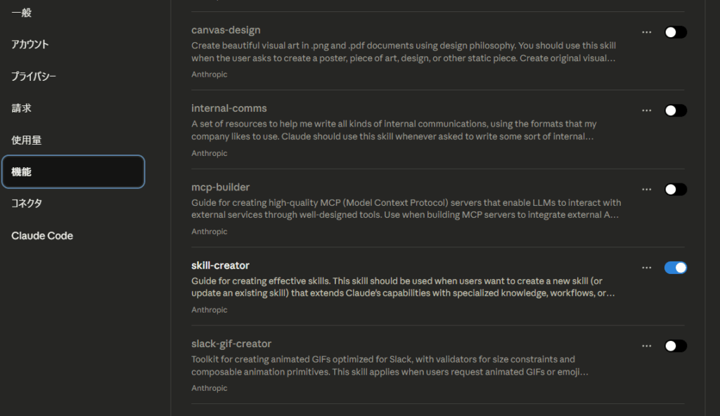 まず、「skill-creator」スキルを活用ます。このスキルは、新しいスキルを作成するためのガイドを提供してくれるClaudeが標準提供しているものです。以下のように「設定」→「機能」でONにしましょう。