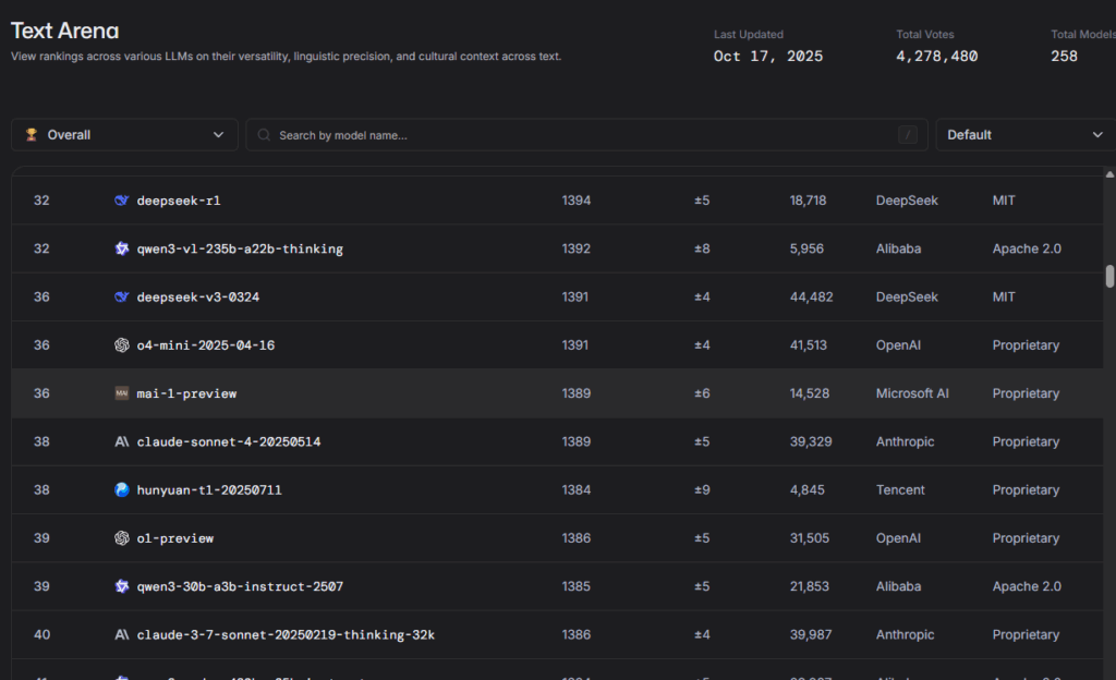 MAI-1はテキスト生成AIとしても一定の性能を持っており、LM Arenaのランキングで36位に位置しています。Anthropic社のClaude 4 SonnetやOpenAIのO1 Previewを上回る性能を示しています。