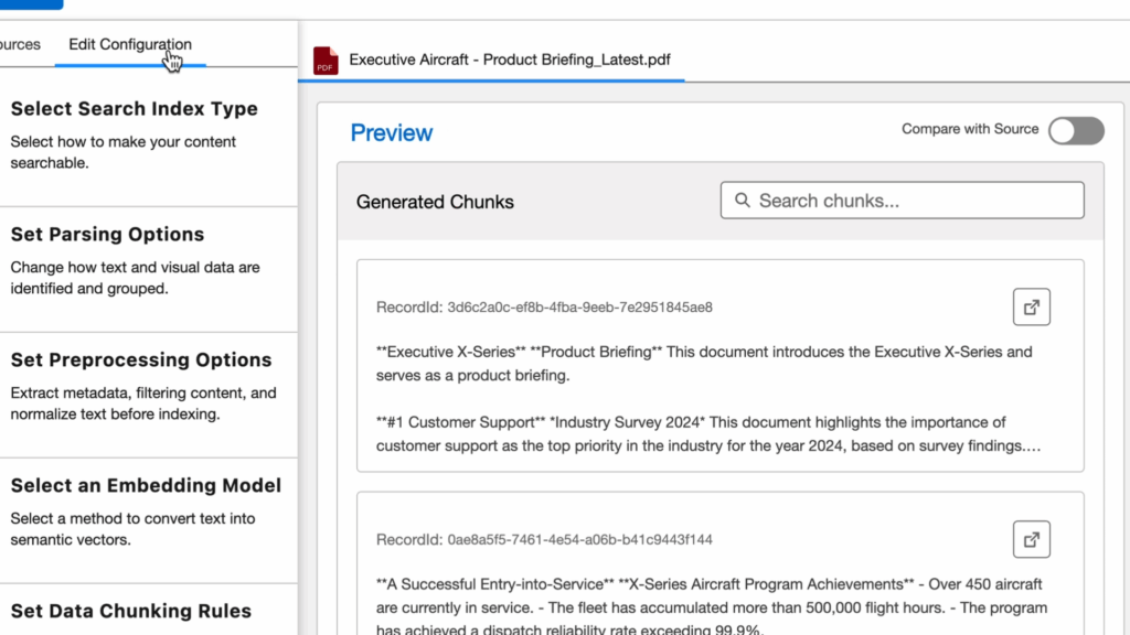 Intelligent Contextでは、文書の種類や業界特性に応じて、解析、処理、チャンク化、埋め込みの最適な戦略を自動的に決定します。また、手動での細かな調整も可能で、企業固有のデータ形式にも対応できます。