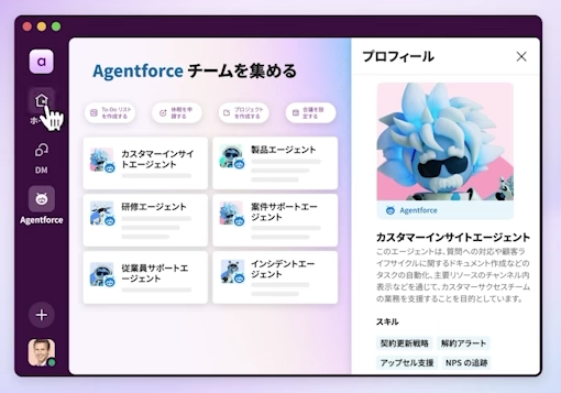 Agentforce 360の革新的な側面の一つが、Slackとの深い統合により、企業向けエージェント型OS(オペレーティングシステム)として機能する点です。この統合により、従業員は普段使用しているSlackインターフェースから直接AIエージェントに依頼や問い合わせを行うことができます。
