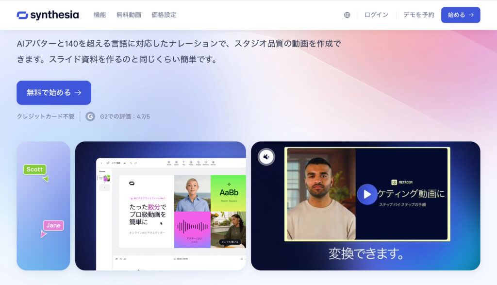 | Synthesia | エンタープライズ向けパーソナライゼーション | AIアバター、120以上の言語対応、企業ブランディング | Webベース | なし | 月額29ドル(年払いの場合月額18ドル) |