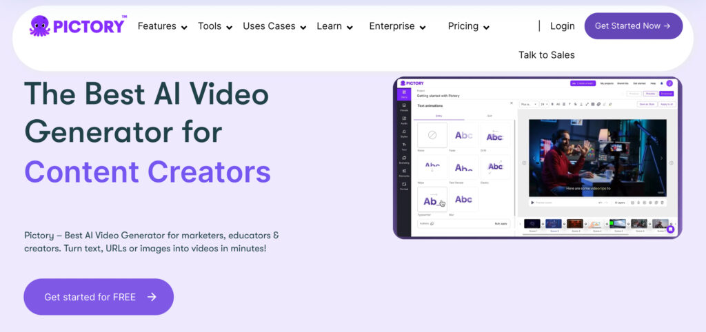 Pictoryは、ブログ投稿、トランスクリプト、既存の動画コンテンツを短く魅力的なクリップに再利用したいマーケターに最適です。Pictoryをテストしたところ、自動字幕生成とハイライトリール作成に感銘を受けました。テキストニュースレターの場合、スクリプトを貼り付けるだけで、すぐにナレーション付き動画に変換できます。