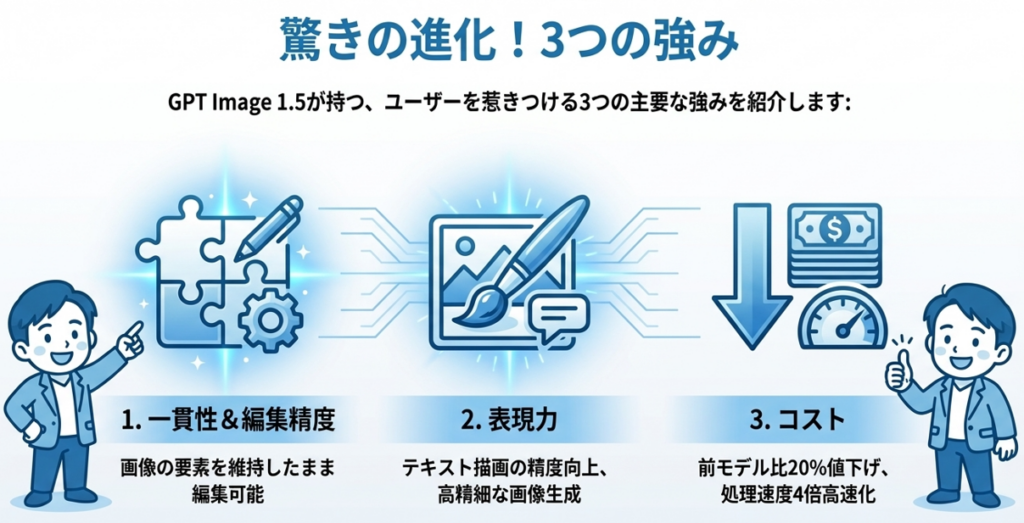 GPT Image 1.5は、従来のGPTイメージと比較して大幅な性能向上を実現しています。特に注目すべき改善点は以下の3つです。