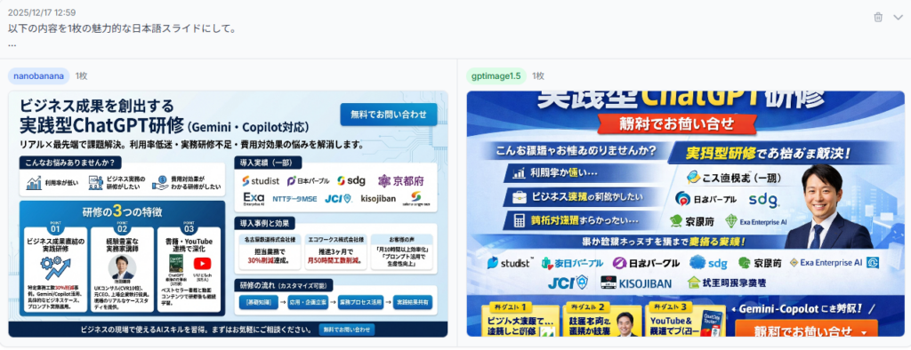 文字化けや不自然な文字配置が頻発し、ビジネス用途での使用は現実的ではありません。この差は、日本語でのコンテンツ制作を主とする企業にとって、モデル選択の決定的な要因となります。