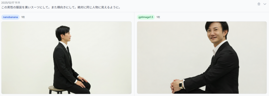 GPT Image 1.5では、この問題が劇的に改善されています。私のテストでは、人物の写真を横向きにして黒いスーツに変更する編集を行いましたが、元の人物の特徴を維持しながら、要求された変更のみが正確に適用されました。この編集精度は、実際にNano Banana Proを上回る場面も多く見られました。