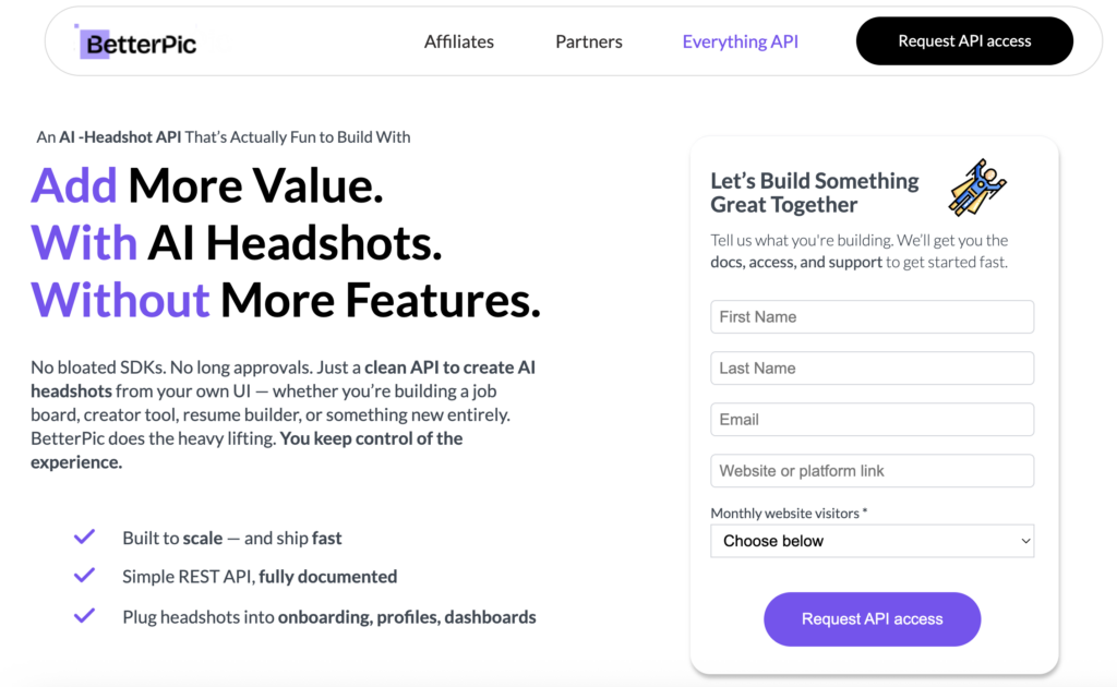 BetterPic APIは、プロフェッショナルで企業グレードのAIヘッドショットに特化した高度に集中したソリューションです。製品哲学の全体が、実験や創造的なバリエーションではなく、一貫性、予測可能性、ビジネス対応の出力を中心に据えられています。