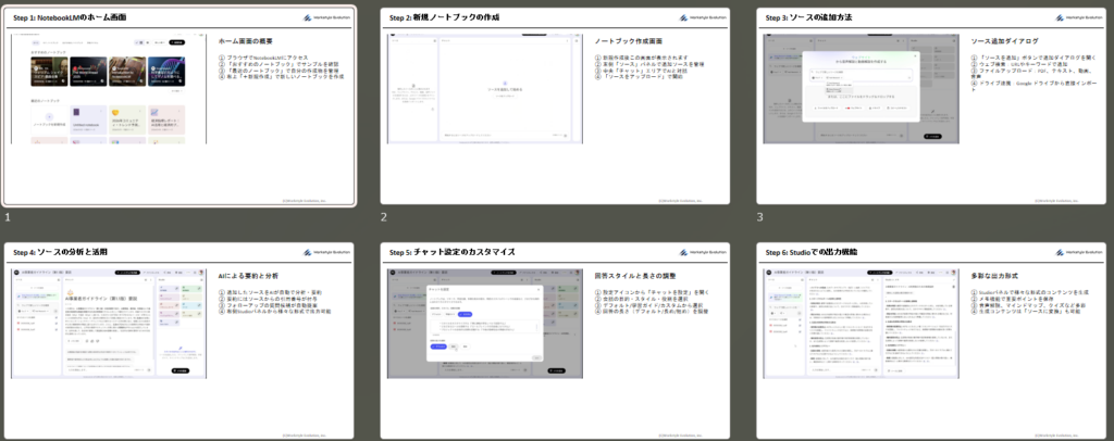 生成されたマニュアルは「粗いけれども実用的」なレベルに達しており、最終的に不要な部分をカットして使用することで、従来の手動作成と比較して大幅な時間短縮が実現できます。
