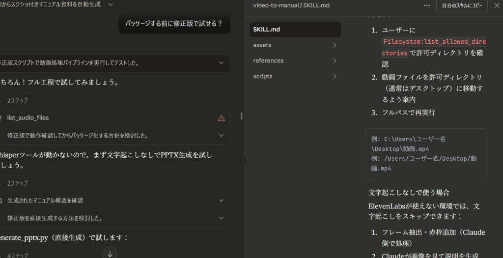Claudeは単にファイルを作成するだけでなく、「ビデオマニュアル」という一つの塊のファイルセットとして、アセットや必要なガイド、作り方まで全てをまとめて作成してくれました。これにより、そのままスキルとして使用したり、ダウンロードして配布することが可能になります。