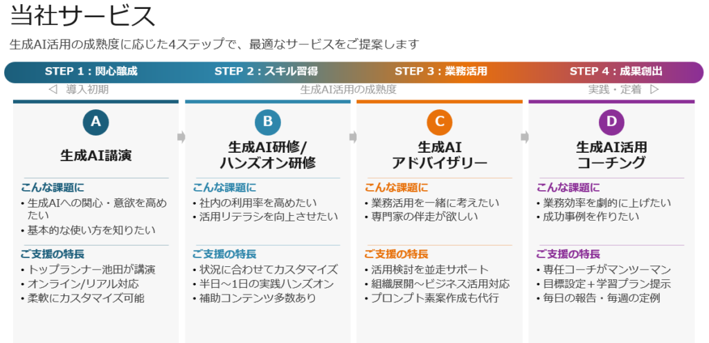最も実用性が高いと感じたのは、既存のスライドフォーマットを維持しながら内容を更新する機能です。例えば、サービス紹介スライドの推薦コメント部分を最新情報に更新する際、以下のような指示が効果的でした: