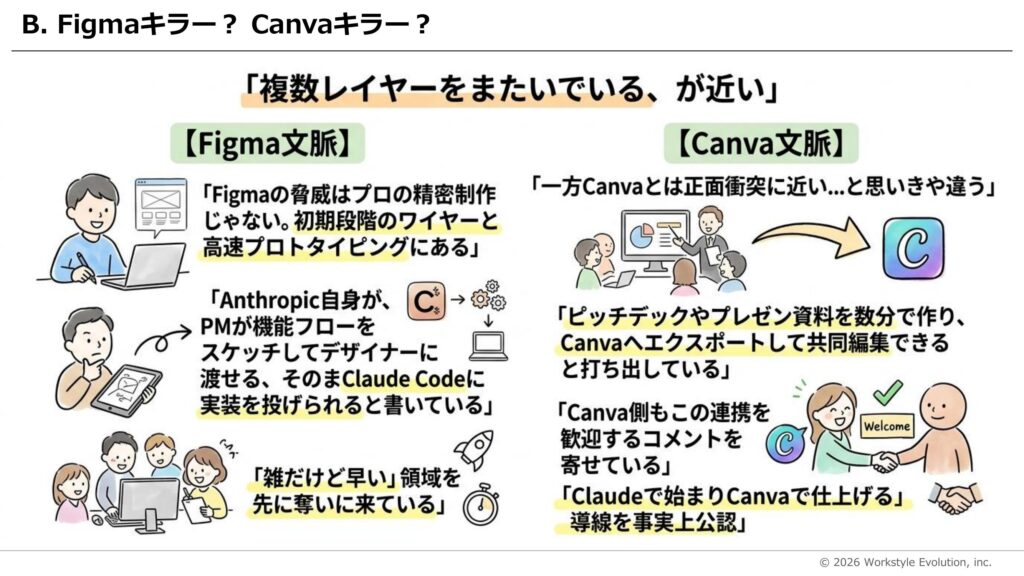 プロのデザイナー向け精密制作はあくまでFigmaの領域、と認めたうえで、Claude Designは「初期段階のワイヤーと高速プロトタイピング」の領域を先に奪いに来ている。