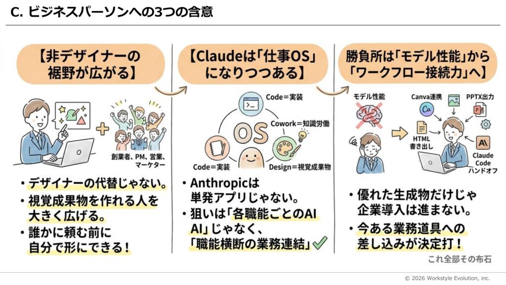 その勢いに乗って同社がいま仕掛けているのが、コード、業務支援、デザインという三つの職能をClaudeという一つの「仕事OS」に束ねる構想である。