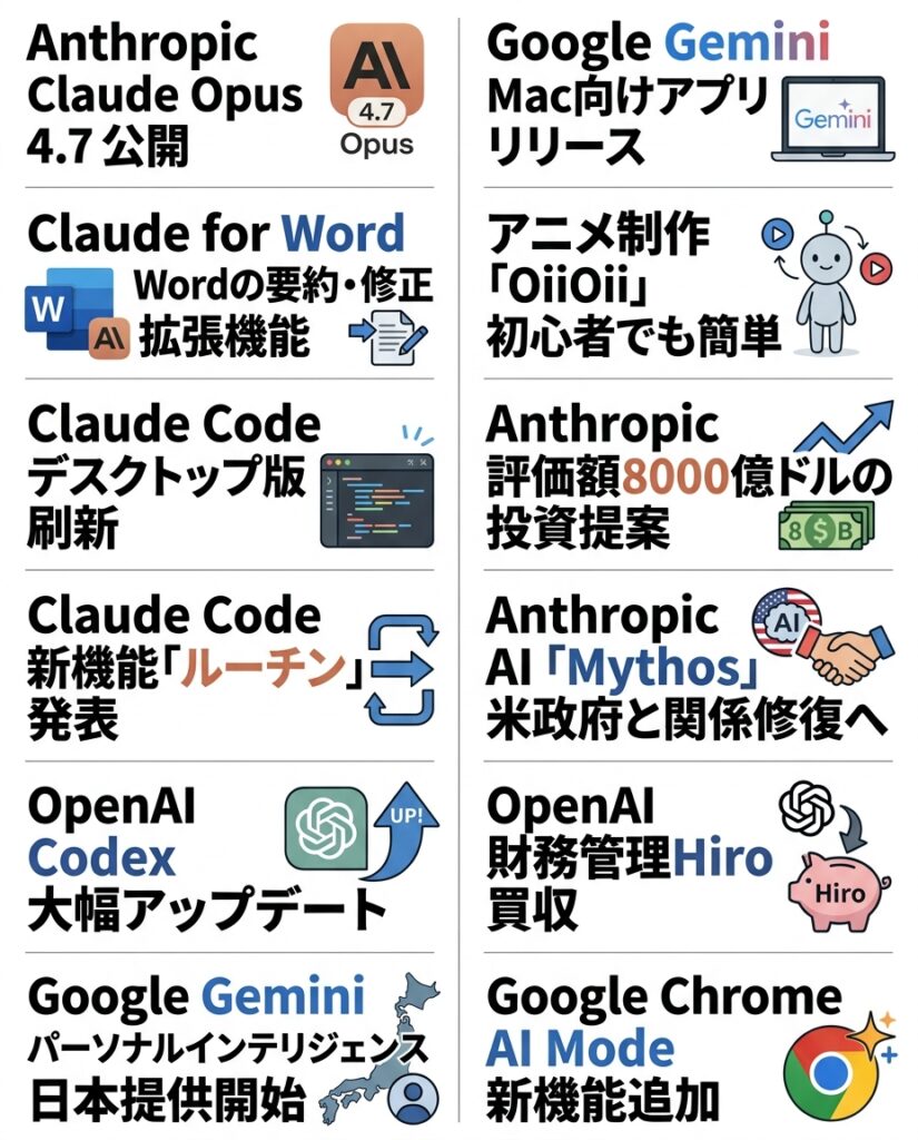 注目AIニュース 2026年4月13日〜Claude Opus 4.7、Claude for Word、OpenAI Codex進化、Anthropic 120兆円評価など18選 - 生成AIビジネス活用研究所